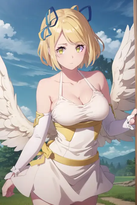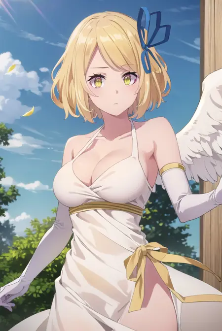 gloves, dress, cleavage, bare shoulders, wings, white dress, bridal gauntlets, feathered wings, angel wings, white wings, angel,