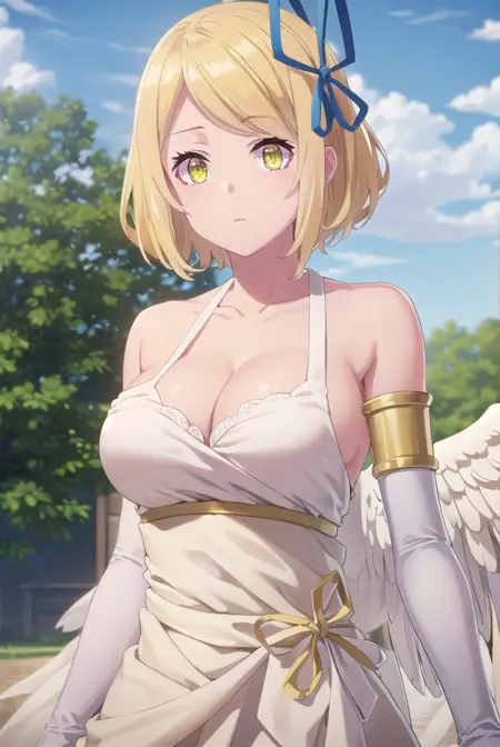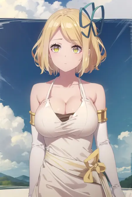tia, short hair, blonde hair, ribbon, hair ribbon, (yellow eyes:1.3),