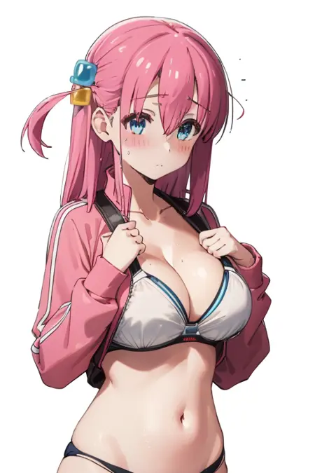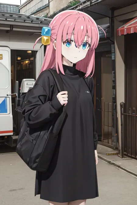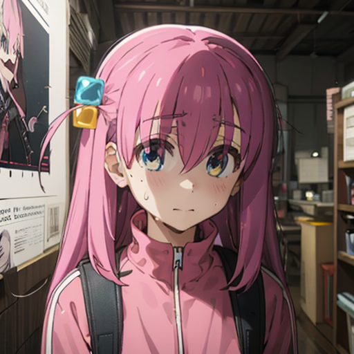 pink hair, long hair, hair between eyes, blue eyes, cube hair ornaments,