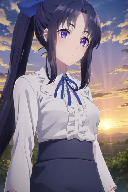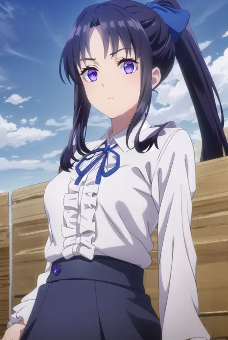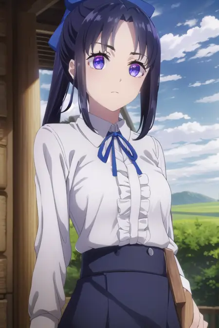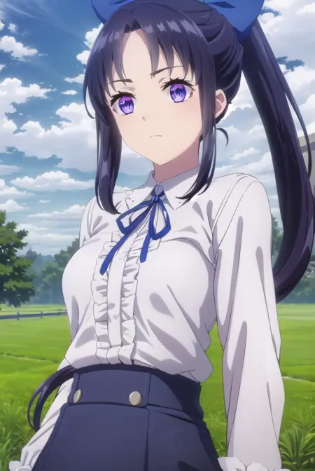 fraurem, 긴 머리, 검은 머리, 리본, (보라색 눈:1.1), 포니테일, 머리 리본, 옆머리,