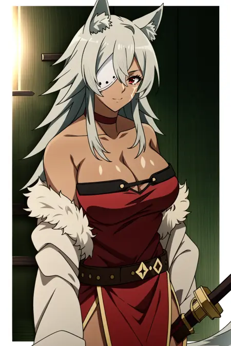 Ghislaine Dedoldia, 1girl, breasts, animal ears, dark skin, eyepatch, solo, dark-skinned female, panties, scar on stomach, underwear, scar, highleg panties, long hair, large breasts, highleg, navel, jacket, fur trim, weapon, sword, black panties, scar on cheek, animal ear fluff, red eyes, choker, pants, scar on face, cowboy shot, abs, off shoulder, fur-trimmed jacket, collarbone, underboob, cleavage, red choker, bandeau, bare shoulders, black jacket, one-eyed, standing, green pants, bangs, belt, hand on hip, grey hair, hair between eyes, sheath