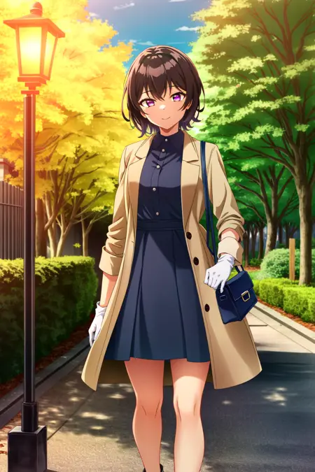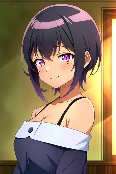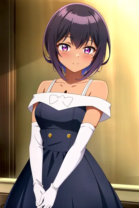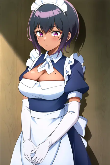Lilth, 1girl, solo, breasts, dark-skinned female, dark skin, cleavage, purple eyes, maid, large breasts, elbow gloves, maid headdress, gloves, short hair, mole, closed mouth, white gloves, short sleeves, outdoors, black hair, puffy short sleeves, mole under eye, puffy sleeves, apron