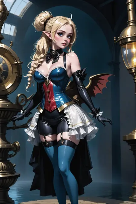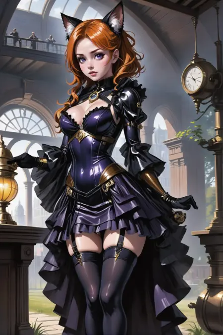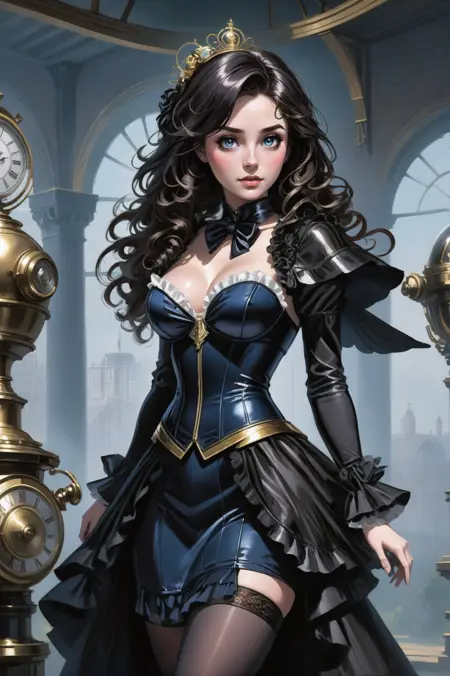 캐릭터에 스팀펑크 스타일의 드레스를 입히고 스팀펑크 분위기의 배경에 놓습니다.