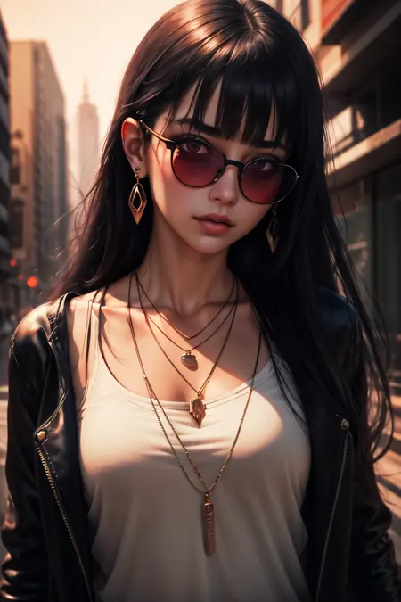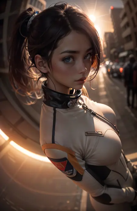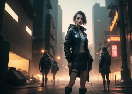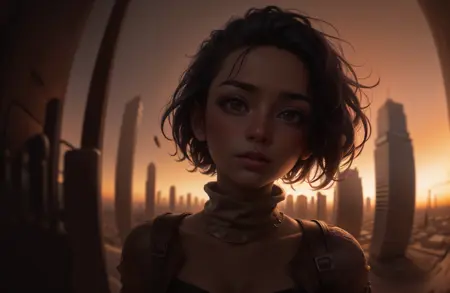 Inspired by dystopia worlds, this model brings easy/complex clothing + futuristic style + beautiful portraits + future backgrounds, all in a dystopia theme style, with dark golden brownish earthy colors and lighting,