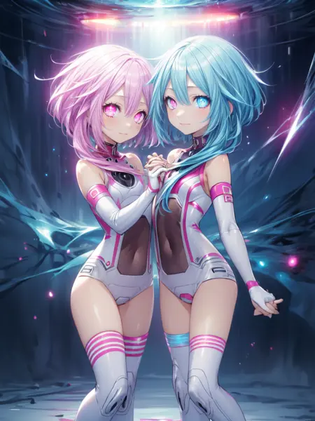 looking at viewer,symbol-shaped pupils,blush,power symbol,bare shoulders,gloves,elbow gloves,long hair,pink hair,blue eyes,blue hair,2girl,short hair with long locks,leotard,smile,white gloves,thighhighs,red eyes,small breasts,sisters,siblings,covered navel,pink eyes,boots,twins,hair between eyes,thigh boots,white thighhighs,white leotard,bodysuit,standing,short hair,sidelocks,flat chest,(((Starry background))),(((Holding hands)))