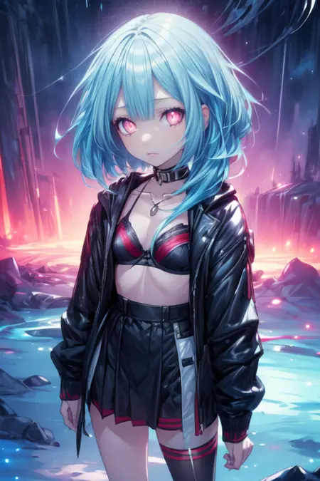 blue hair,1girl,symbol-shaped pupils,looking at viewer,blush,red eyes,gloves,elbow gloves,short hair with long locks,power symbol,solo,bare shoulders,white gloves,leotard,long hair,small breasts,thighhighs,smile,pink eyes,covered navel,sidelocks,boots,standing,full body,thigh boots,halterneck,turtleneck,white footwear,purple eyes,hair between eyes,white thighhighs,flat chest,magical girl,white leotard,flipped hair,thigh gap,(((city background)))