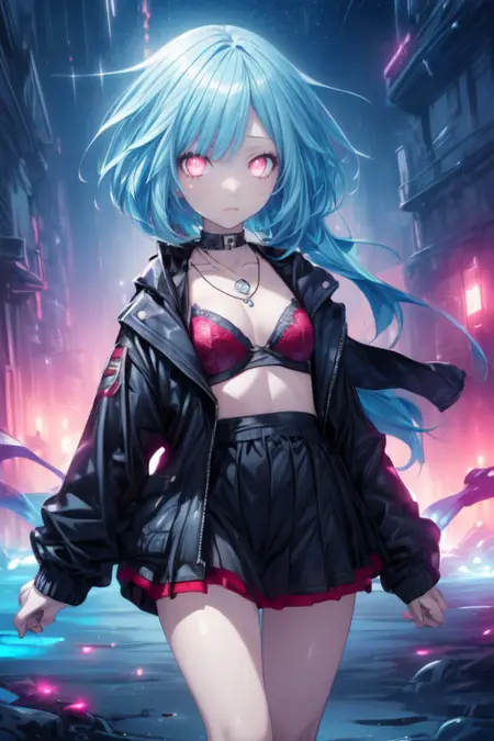 蓝发,1个女孩,符号形瞳孔,看着观众,脸红,红眼,手套,肘部手套,短发带长发绺,电源符号,单人,裸露肩膀,白手套,紧身衣,长发,小乳房,大腿袜,微笑,粉眼,遮盖肚脐,侧发绺,靴子,站立,全身,大腿靴,吊带领,高领,白色鞋履,紫眼,头发在眼睛之间,白色大腿袜,平坦胸部,魔法少女,白色紧身衣,翻转的头发,大腿间隙,(((城市背景)))