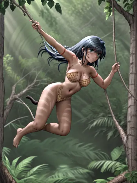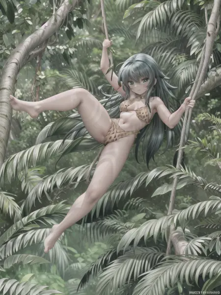 Dark skin,1girl,Dark-skinned female,solo,long hair,green eyes,animal print,leopard print,jewelry,large breasts,navel,green hair,blush,dirty,solo focus,outdoors,jungle background,strapless bra