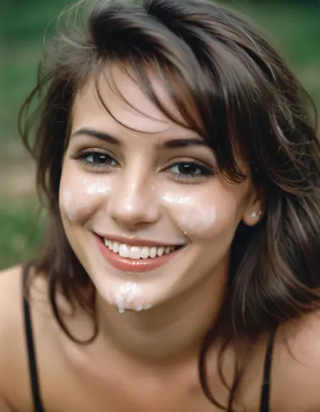 - Color-associated region in two identical side-by-side photographs of a naked woman laying on a bed with cum between her breasts and on her stomach. Trimmed pubic hair. The magenta region is cum.
