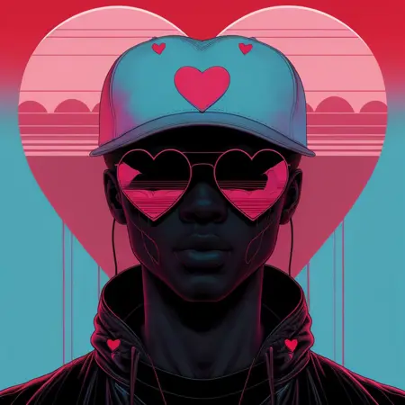 示例提示: lora:blacklove:1 Black Love, Pop Art style portrait, individual, 1girl, dark skin, afro-textured hair, heart-shaped pink sunglasses, striped heart background, fitted baseball cap with a heart emblem, subtle patterns, cool and contemporary vibe, vibrant and striking, trending on ArtStation.