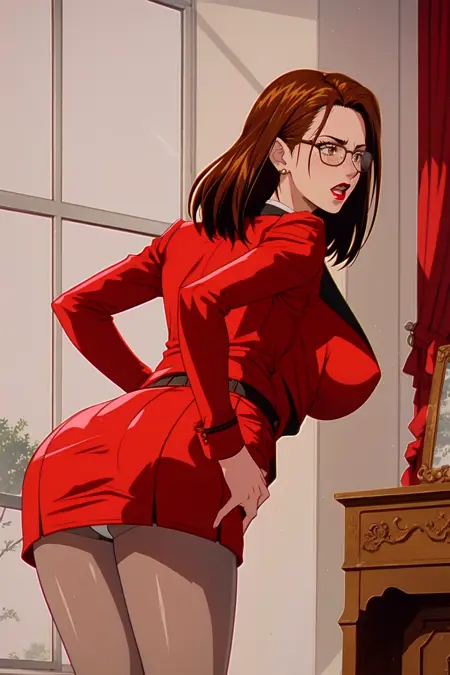 MaiKannazuki, 1girl, 成熟女性, 棕发, (单侧发辫:1.2), 棕眼, 耳环, 红唇, 眼镜,