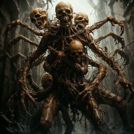 1other, alley, bald, blood, blurry, blurry background, claws, cloud, dimly lit, extra arms, extra heads, extra legs, glowing, glowing eyes, long fingernails, looking at viewer, monglork, no humans, open mouth, red eyes, ribs, ruins, sewer, sharp fingernails, sharp teeth, sinew, skeleton, skull, sky, standing, teeth, tentacles, tongue, tongue out, tree,
