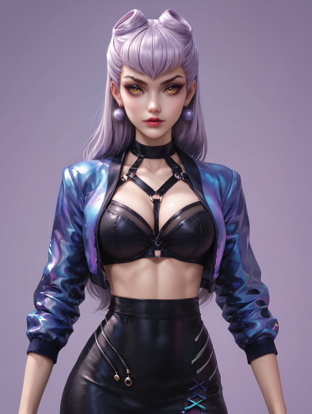 全身提示: 1girl, evekda, 浅紫色头发, 耳环, 穿黑色乳胶胸衣, 吊带上衣, 短夹克, 蓝色蛇皮夹克, 连裤袜裙, 高跟鞋, 全身,