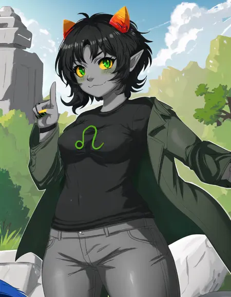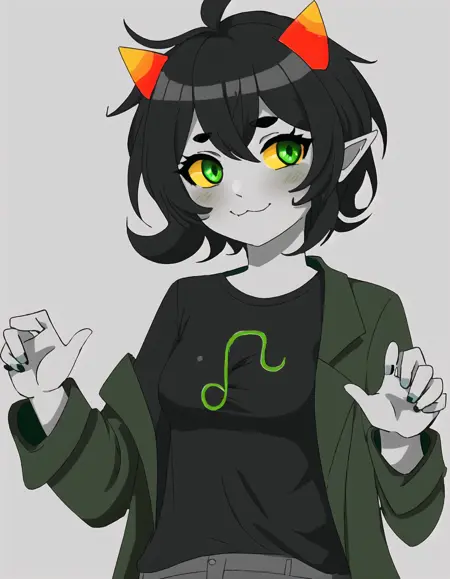 Situational prompts: colored skin, grey skin, black hair, yellow sclera, horns, black shirt, green coat, symbol on shirt