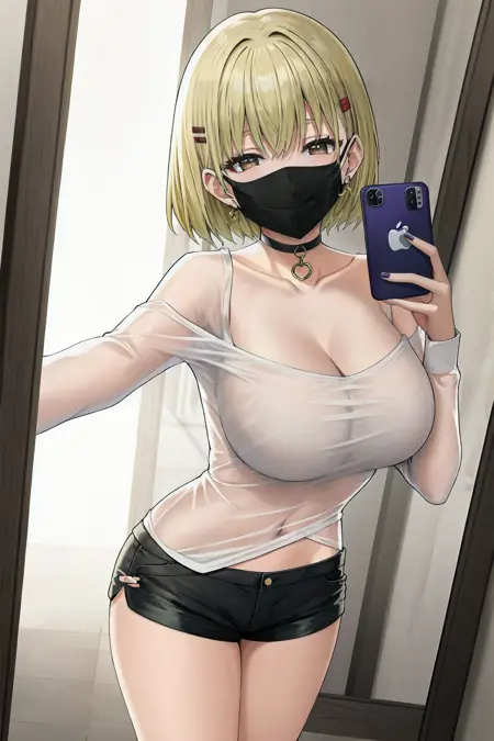 short hair, brown eyes, large breasts, hair ornament, blonde hair, bangs, hairclip