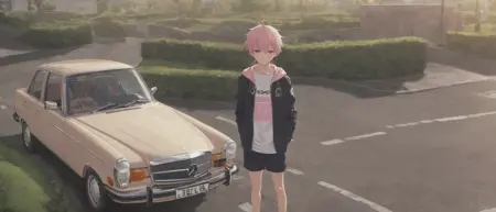 Meanwhile, I don't have resources to either train model (hardware / time / human resources, or interest), or even conduct a throughful evaluation (like team lycoris and deepghs) of a model. All I can do is conduct a subjective HTP Test towards the model, assuming it projects its natural behaviour. Therefore you will see "a pink hair boy interacting with a car, with random but filled backgound".