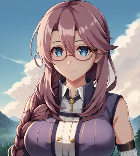 <lora:TrailsOfColdSteel-ClassVII:0.9>, emmacs1, long hair, purple hair, braided ponytail, glasses, blue eyes, large breasts, blue ascot, red school uniform, white shirt, plaid skirt, black thighhighs, loafers,