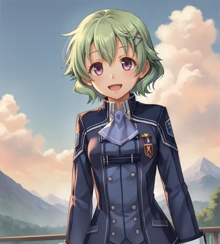 <lora:TrailsOfColdSteel-ClassVII:0.9>, mussethors, green hair, short hair, hair ornament, purple eyes, medium breasts, blue ascot, school uniform, blue blazer, blue skirt, brown thigh boots,