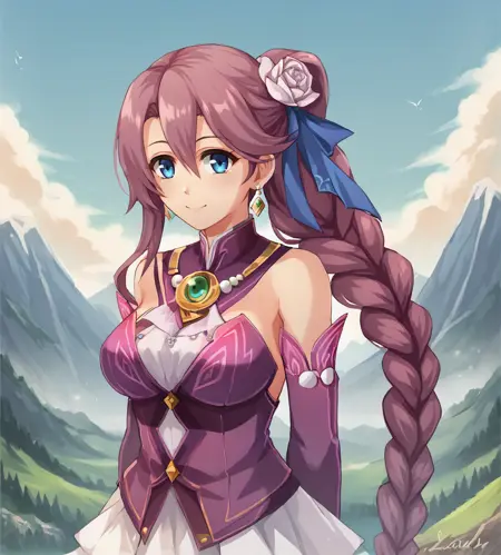 <lora:TrailsOfColdSteel-ClassVII:0.9>, emmamagicalgirl, purple hair, long hair, braided ponytail, hair flower, blue eyes, hair ribbon, jewelry, earrings, purple dress, detached sleeves, white skirt, black pantyhose, purple high heels,