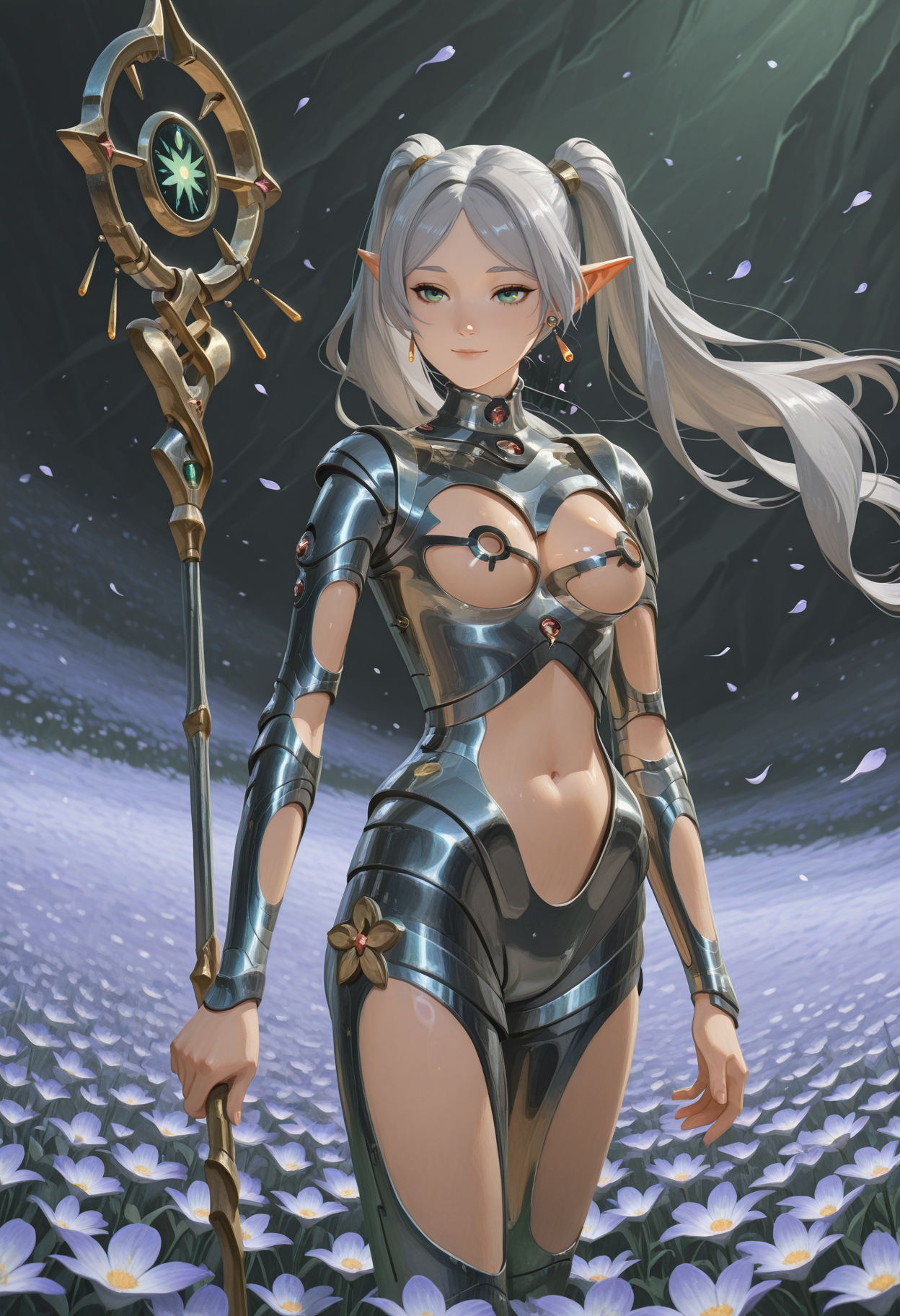 Main tags: "metal bodysuit, cleavage cutout, underboob cutout, stomach cutout, arm cutout, thigh cutout, leg cutout, gauntlets"