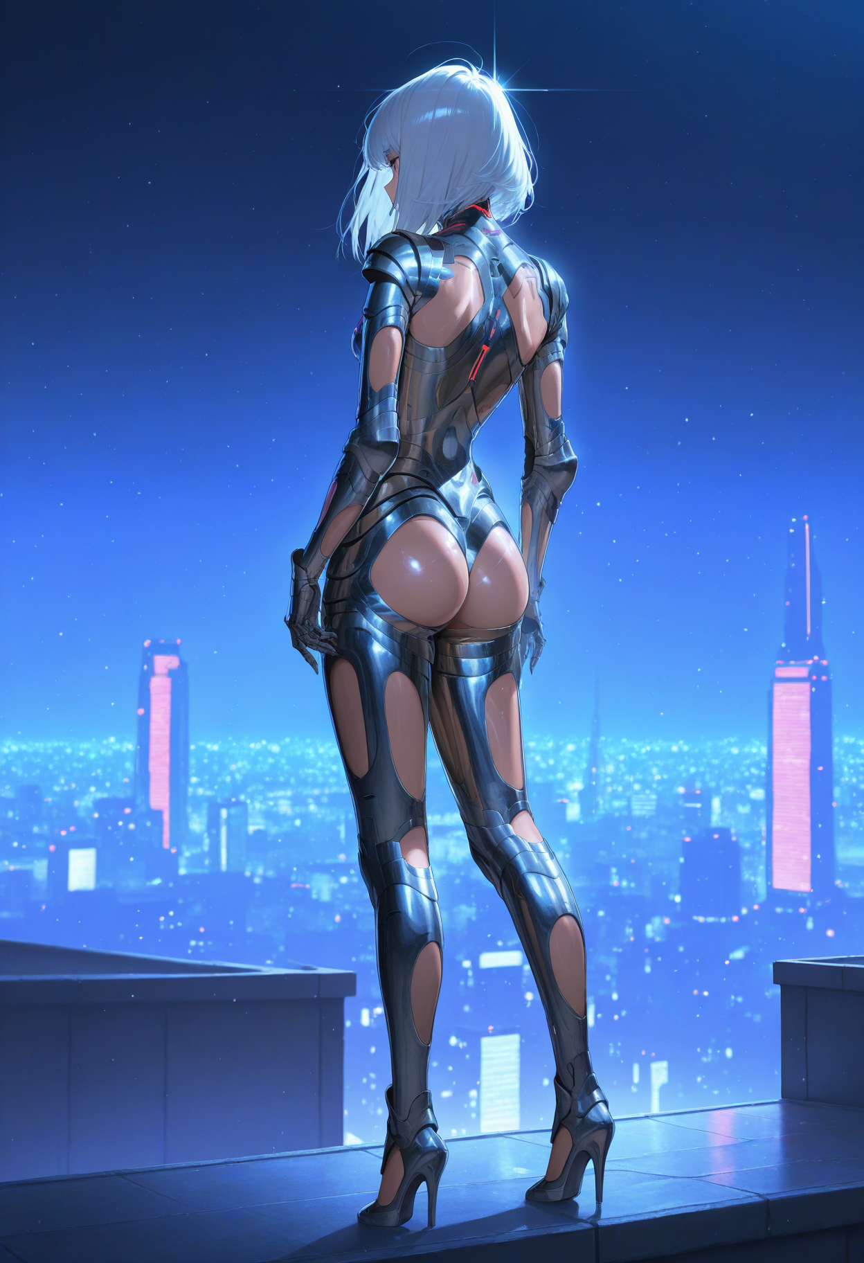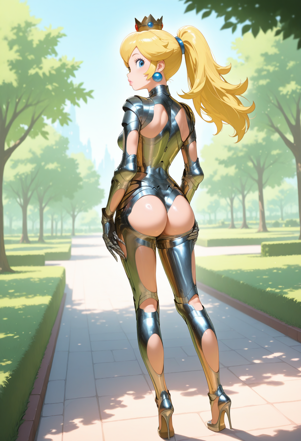 From behind: metal bodysuit, arm cutout, ass cutout, leg cutout, high heels, gauntlets, from behind, diamond necklace