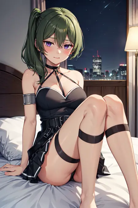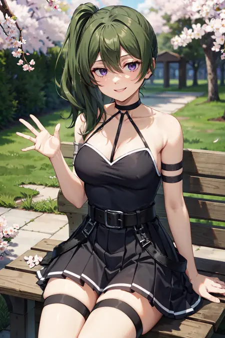 - ubel,long hair,side ponytail,hair between eyes,bangs,black choker,bare shoulders,cleavage,halterneck,black dress,sleeveless,arm strap,single glove,belt,black skirt,buckle,black belt,thigh strap,knee boots,black footwear