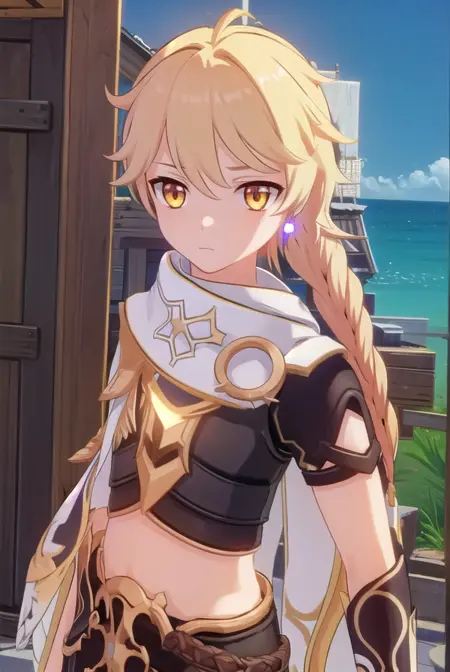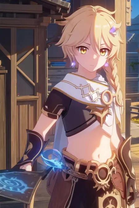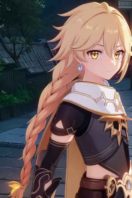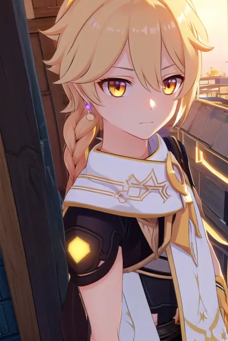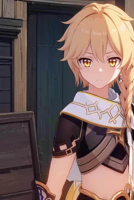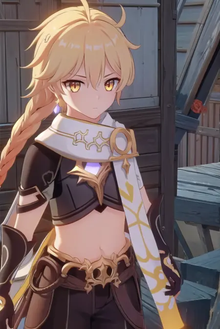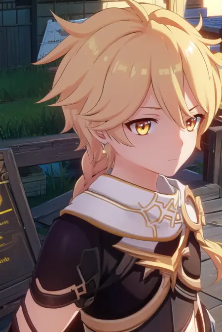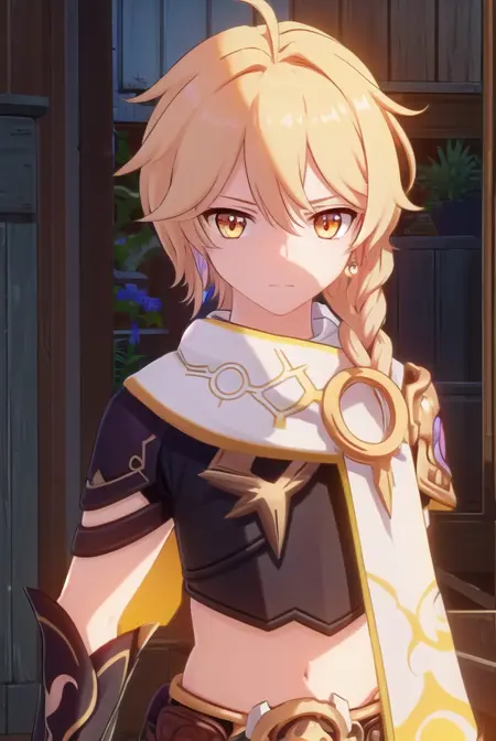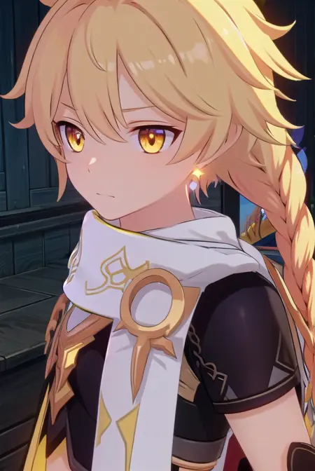 aether、長い髪、前髪、金髪、目の間に髪、(黄色い目:1.3)、編み髪、男性を中心に、単一の編み髪、