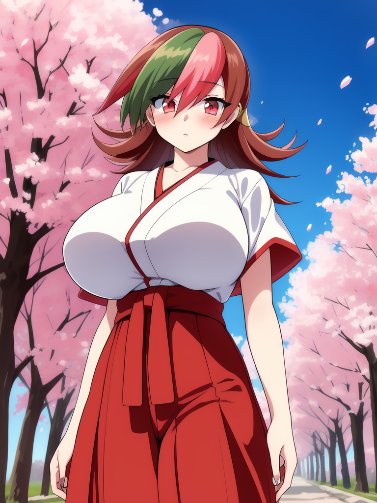 SaiHinoki, 염색한 앞머리, 큰 가슴, 거대한 가슴, 갈색 머리카락, 다색 머리카락, 붉은 눈, 이색 머리카락, 긴 머리카락