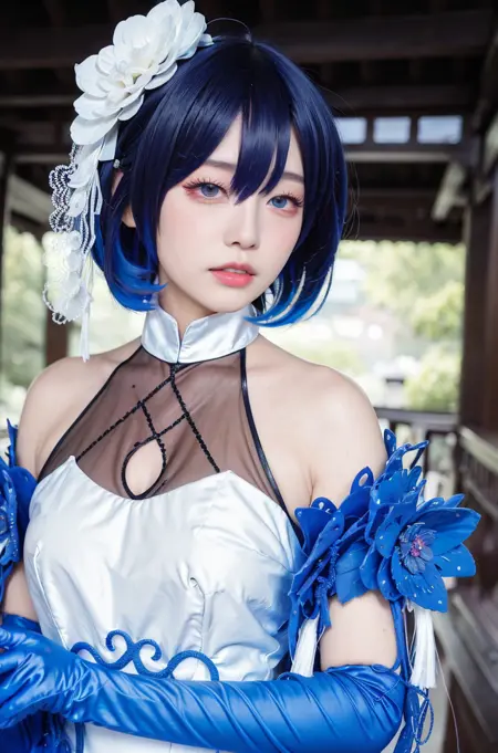 I recommend using these tags: china_dress, chinese_clothes,dress, gloves,blue_eyes
