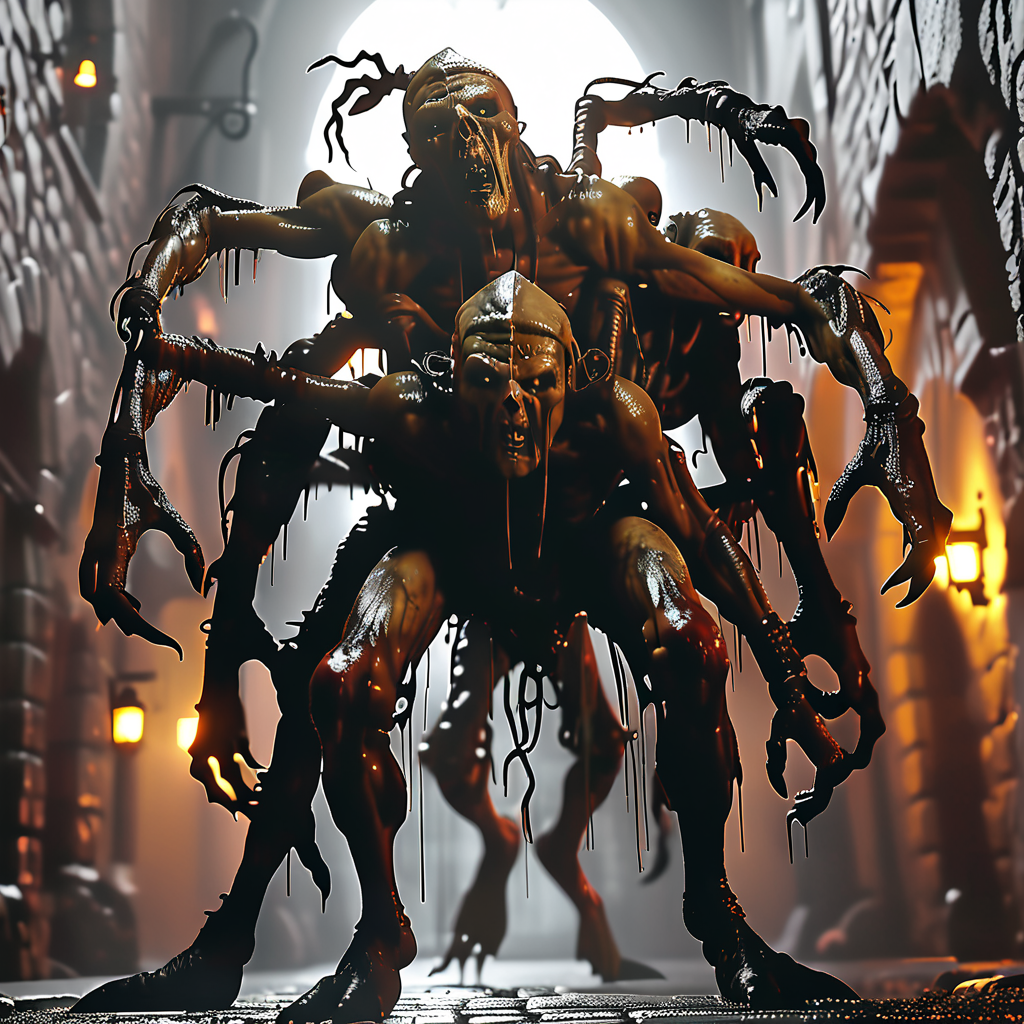1other, alley, bald, blood, blurry, blurry background, claws, cloud, dimly lit, extra arms, extra heads, extra legs, glowing, glowing eyes, long fingernails, looking at viewer, monglork, no humans, open mouth, red eyes, ribs, ruins, sewer, sharp fingernails, sharp teeth, sinew, skeleton, skull, sky, standing, teeth, tentacles, tongue, tongue out, tree,