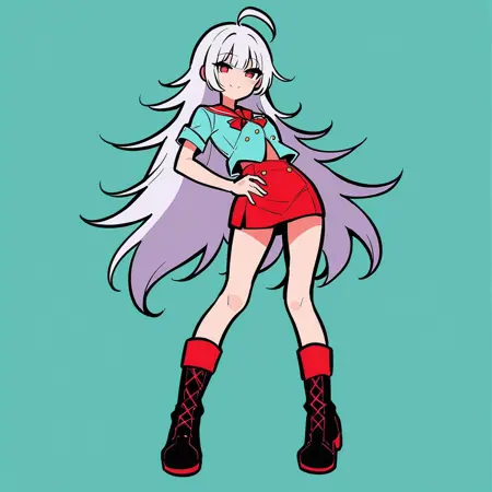 例:Masterpiece, best quality, two-tone background, blue background, flat color, 1girl, solo, shirt, skirt, long sleeves, white shirt, shoes, full body, hat, shirt tucked in, bag, sleeves past wrists, earrings, white footwear, jewelry, sleeves past fingers, socks, baseball cap, border, pink headwear, standing, print shirt, short hair, shoulder bag, blue skirt, black hair, blue eyes, blue hair, red headwear