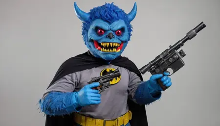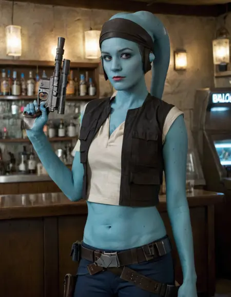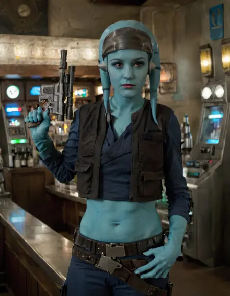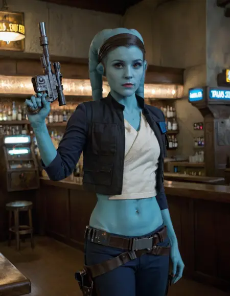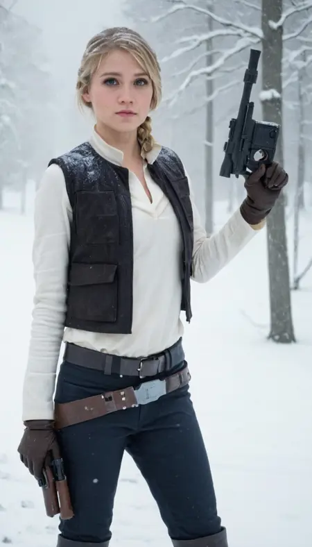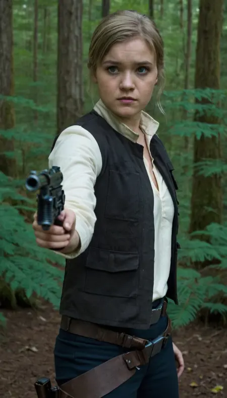 トリガー語: ブラスターには「彼/彼女が詳細な手にDL-44ブラスターピストルを握っている」と入力してください。衣装には「Han Solo コスプレ衣装を着用している」と入力してください。