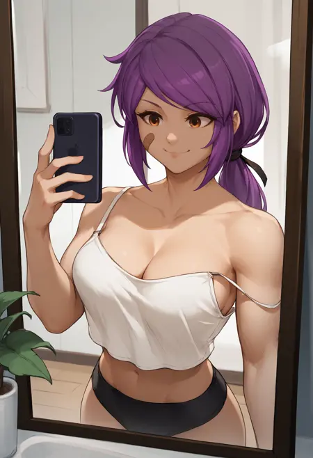 Always needed: "leaairi, brown eyes, single bandaid on cheek, short hair, purple hair, low ponytail, hair ribbon, large breasts, fit"