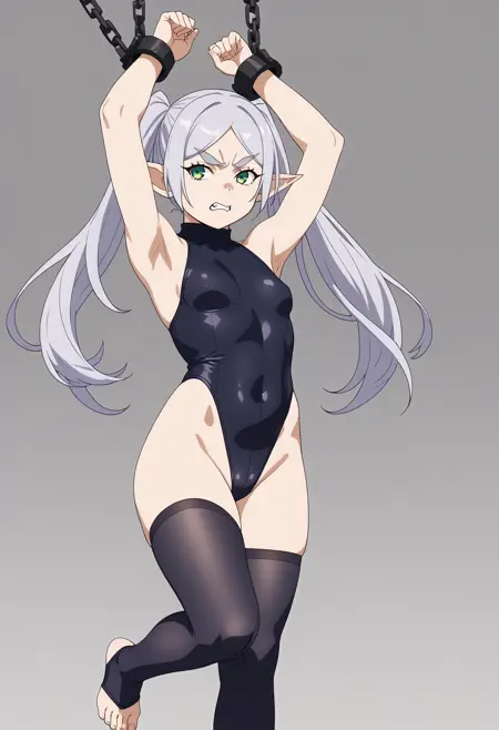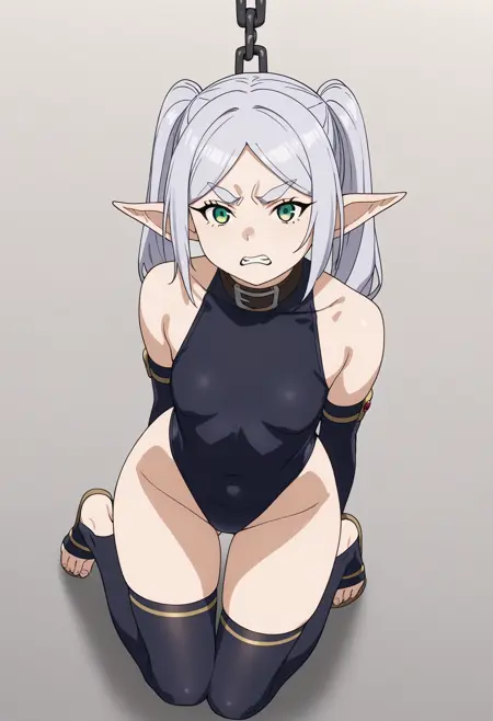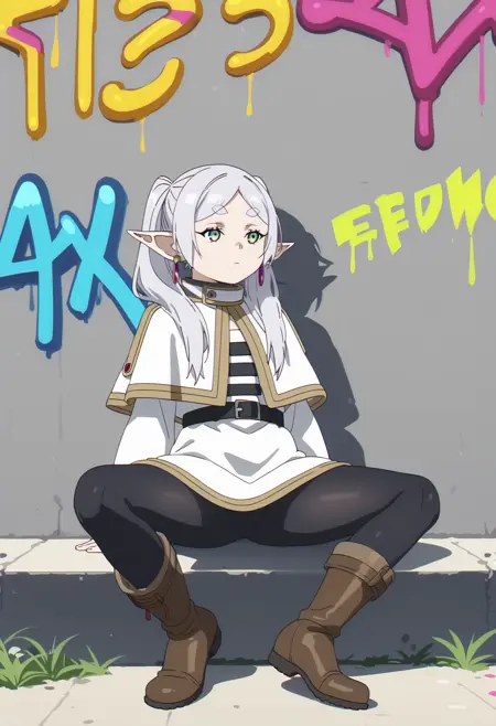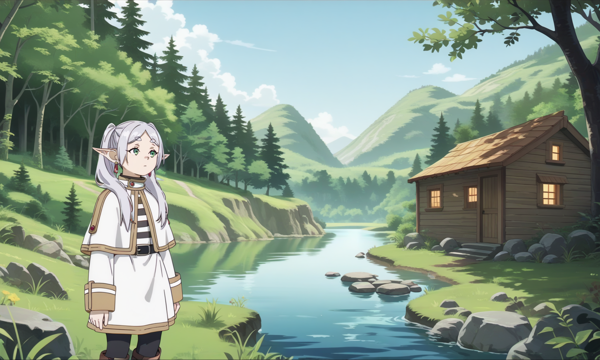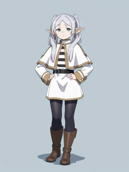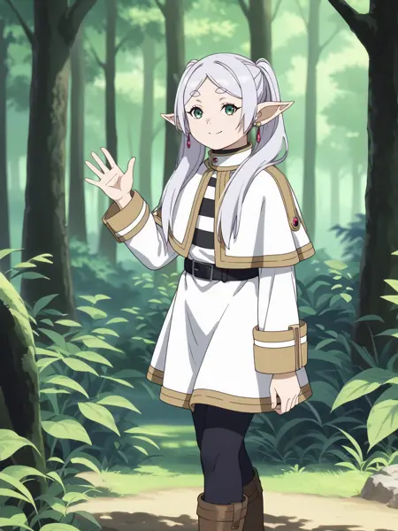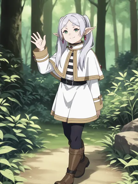 Basic prompts : 1girl, frieren, green eyes, grey hair, twintails, pointy ears, eyebrows, earrings