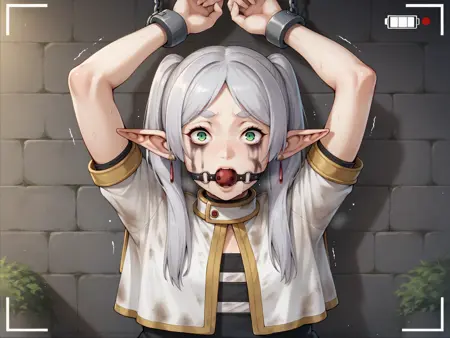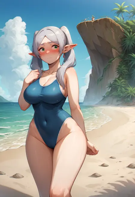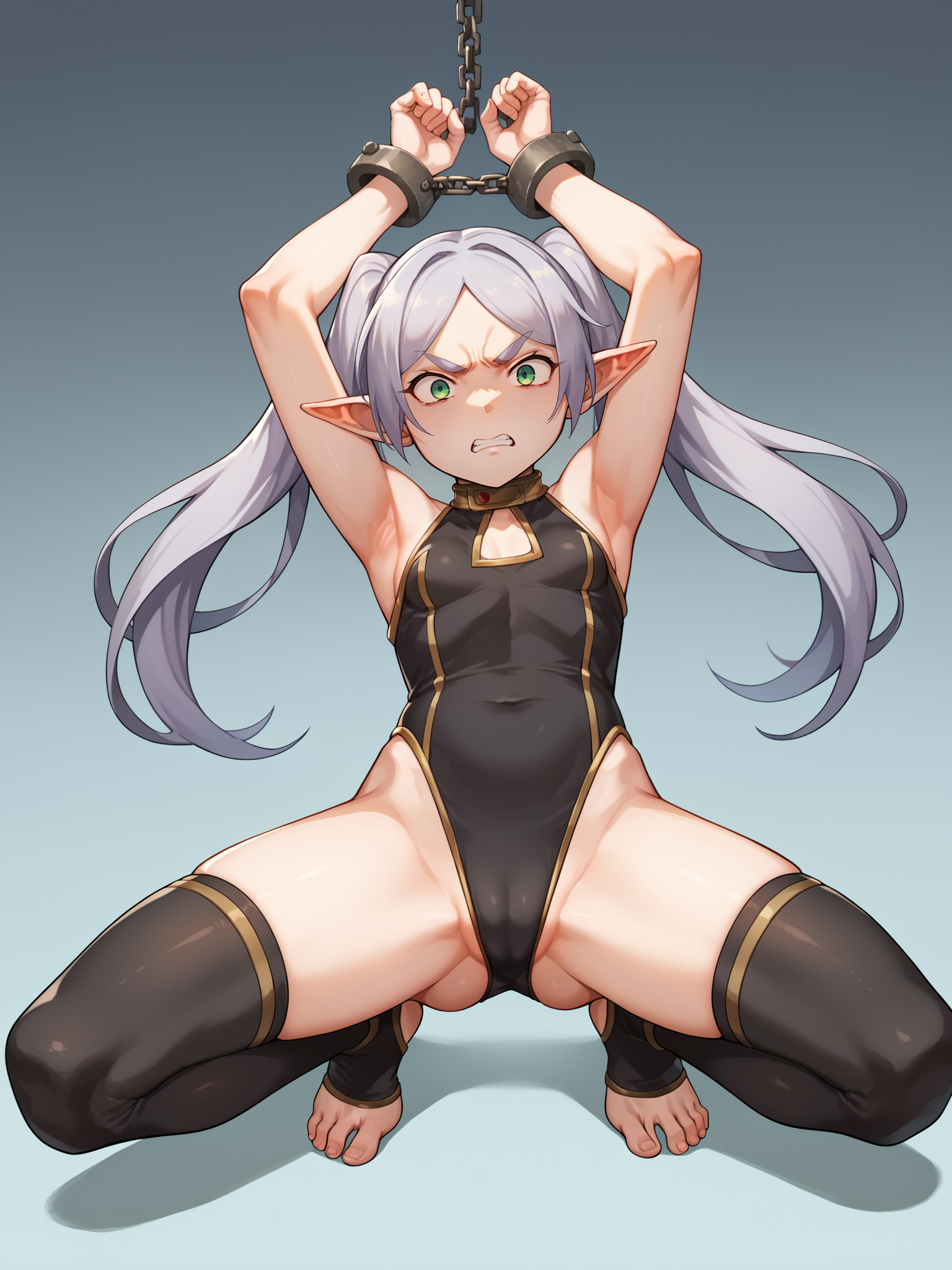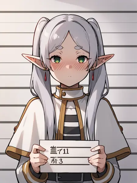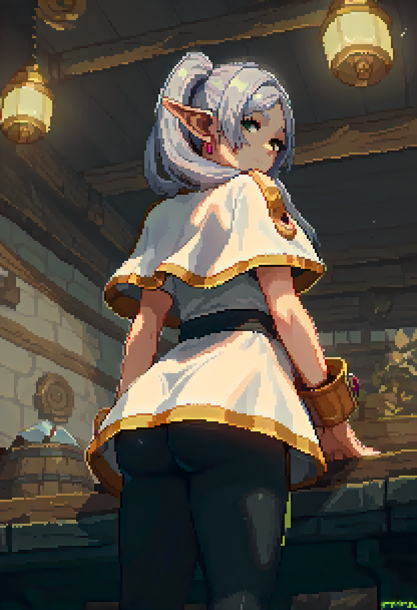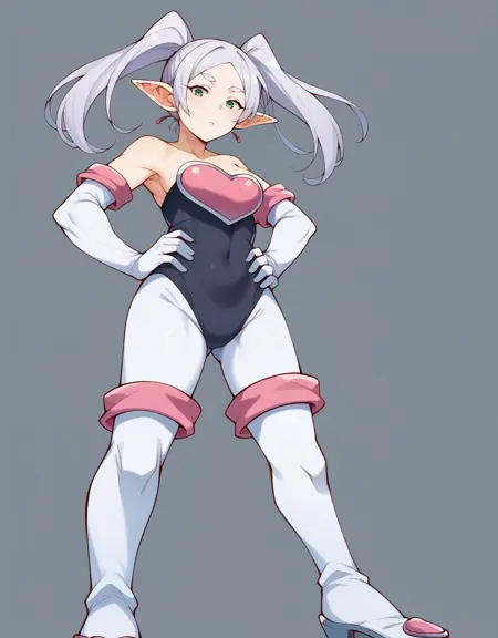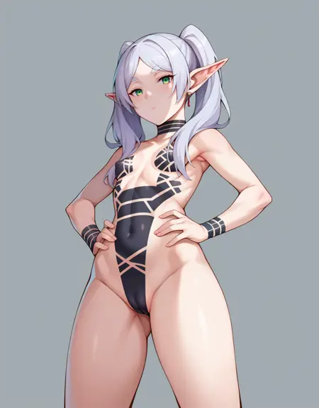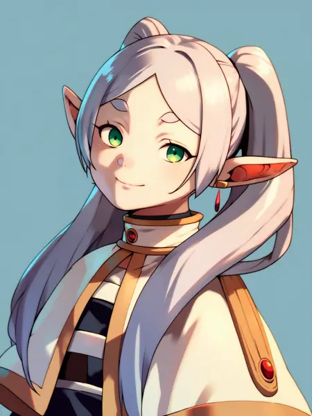 Basic prompts : 1girl, frieren, green eyes, grey hair, twintails, pointy ears, eyebrows, earrings