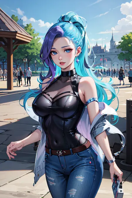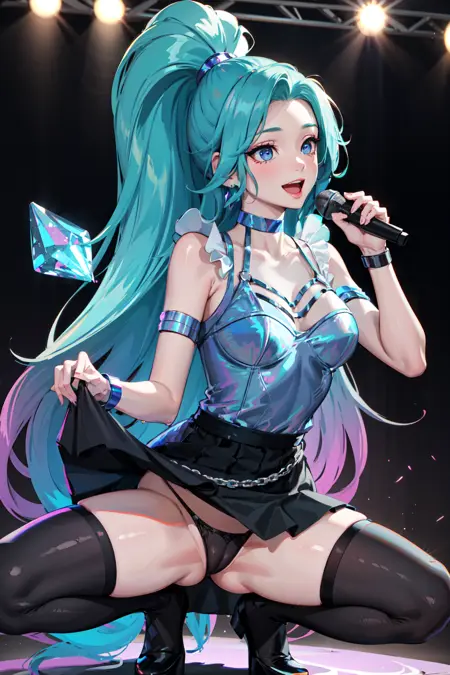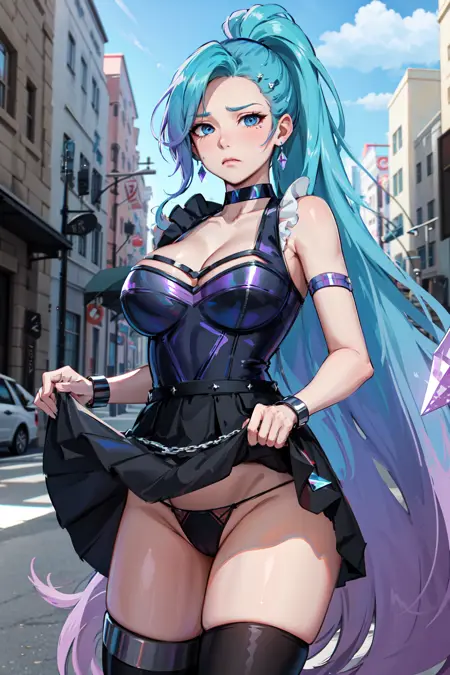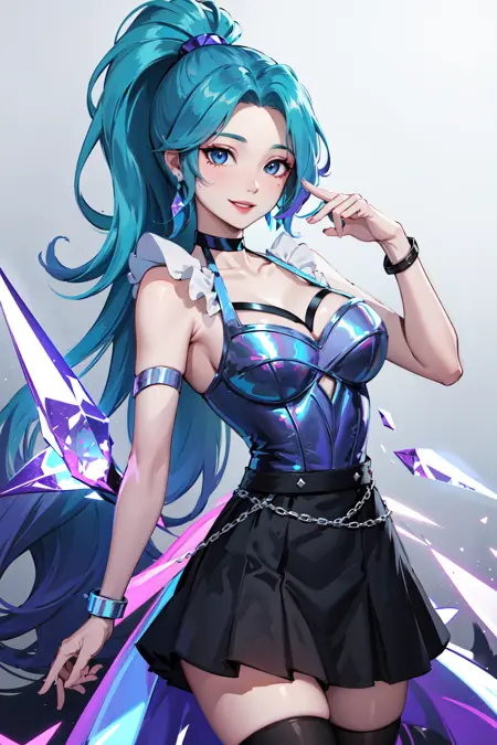 seraphine1, 1girl, solo, 파란 머리, k/da (리그 오브 레전드), 매우 긴 머리, 여러 색상의 머리카락, 보석, 단발 고리, 파란 눈, 귀걸이, 드레스, 검은 목걸이, 이중 색상 머리카락, 보라색 머리카락, 검은 허벅지 높이 양말, 팔찌, 검은 스커트, 크리스탈