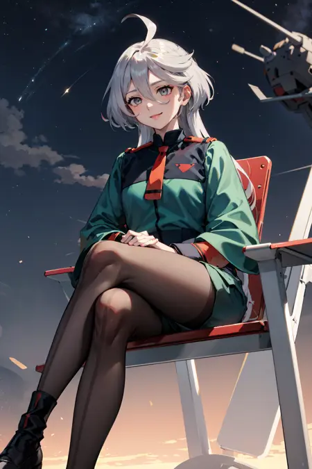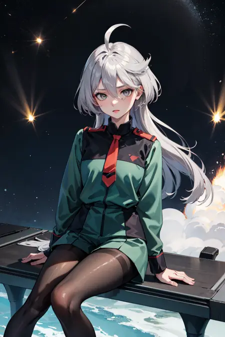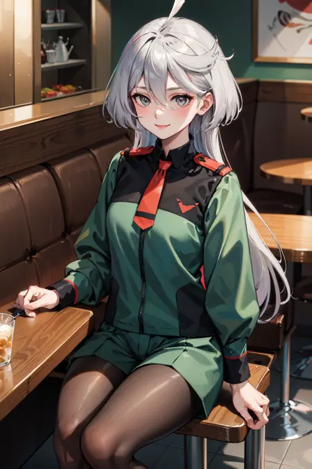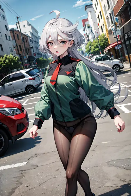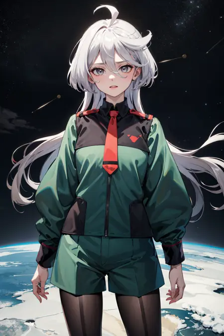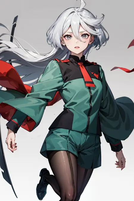 miorine1, miorine rembran, asticassia 학교 정장, 솔로, 긴 머리, 회색 눈, 회색 머리, 아호게, 레이어드 레깅스, 초록색 반바지, 넥타이, 보大多, 눈 사이의 머리카락, 검은 팬티스타킹, 긴 소매, 초록색 자켓, 떠 있는 머리카락, 빨간 넥타이