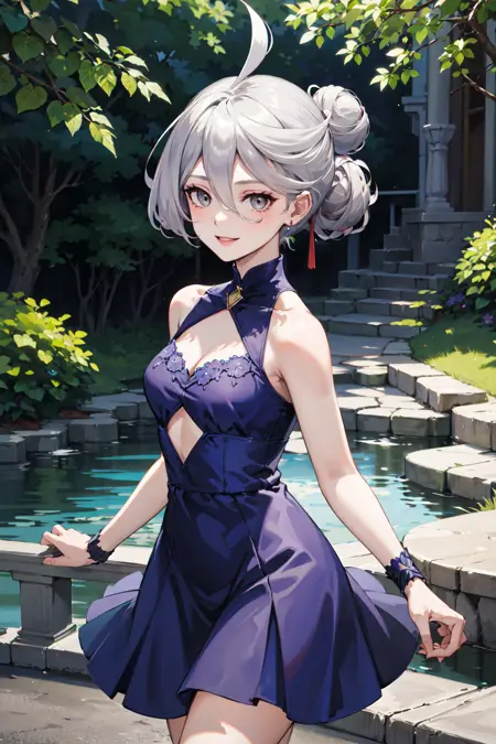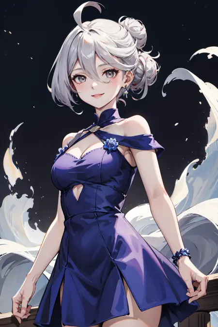 miorine2, 1걸, miorine rembran, 머리끈, 솔로, 회색 머리, 스lee브리스 드레스, 아호게, 회색 눈, 파란 드레스, 눈 사이의 머리카락, 보大多, 벌거벗은 어깨, 귀걸이, 중간 크기 가슴, 발랄한 가슴 모습