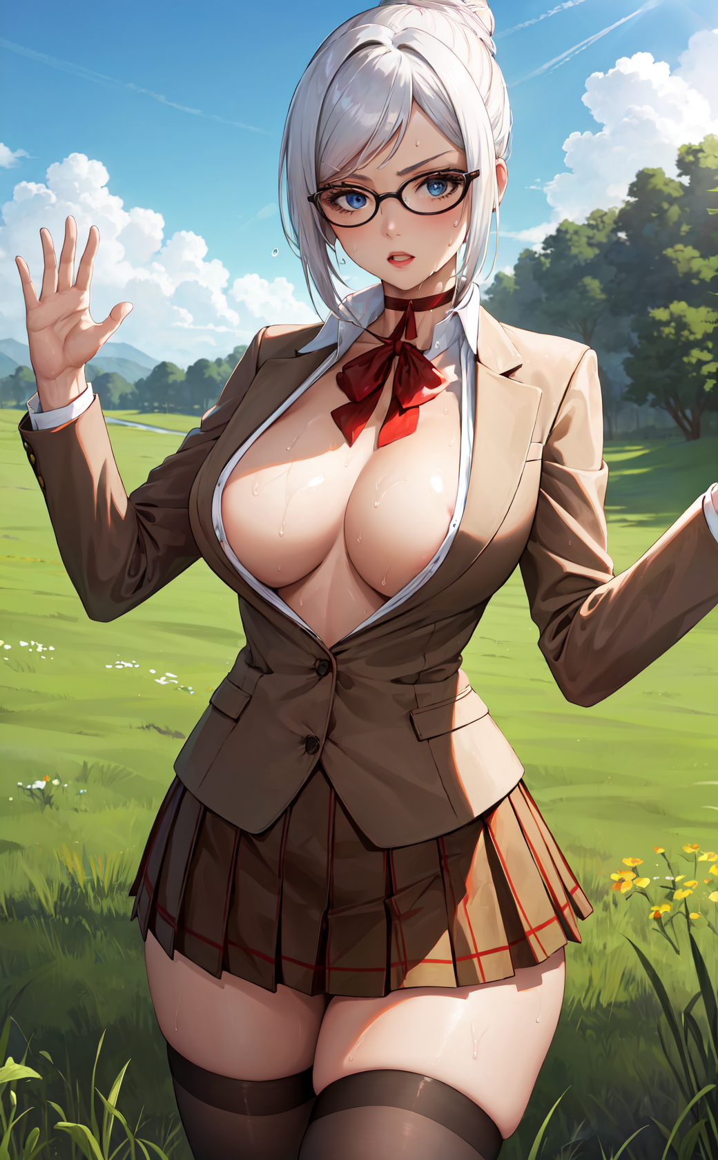skirt, thighhighs, long sleeves, choker, neck ribbon, red bowtie, bow, ribbon, cleavage, school uniform, collarbone, jacket, braid, thighs, pleated skirt, open clothes, black thighhighs, miniskirt, bowtie, red bow, open jacket, zettai ryouiki, open shirt, no bra, skindentation, buttons, blazer, black-framed eyewear, brown skirt, brown jacket, unbuttoned, brown thighhighs, partially unbuttoned,