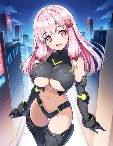 n@cht, pink eyes, white symbolic pupils, pink hair, low tied sideburns, red ribbons, hair bows, hair clips, hair ornaments, and others as appropriate.