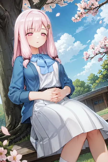 触发词:n@cht、粉红色眼睛、白色符号状瞳孔、粉发、低扎侧发、红色蝴蝶结、发带、发夹、发饰等。