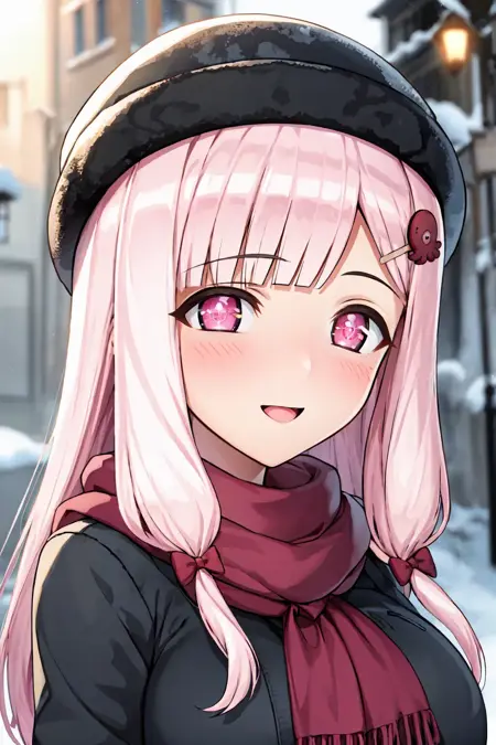 トリガーワードはn@cht, pink eyes, white symbol-shaped pupils, pink hair, low-tied sidelocks, red bow, hair bow, hairclip, hair ornament,他