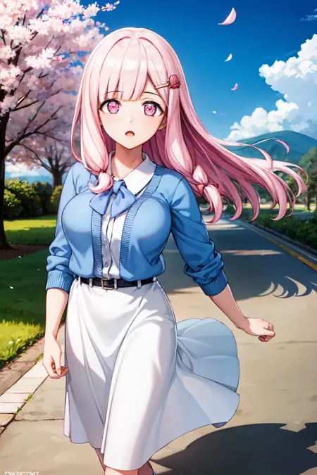 n@cht, pink eyes, white symbolic pupils, pink hair, low tied sideburns, red ribbons, hair bows, hair clips, hair ornaments, and others as appropriate.