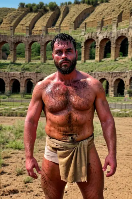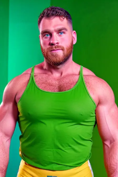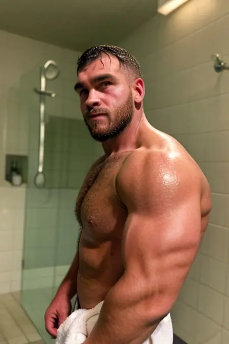 백인 남성 모델, 근육형 곰 몸매, 털이 많은 몸, 갈색 머리카락과 수염을 가진 모델, 성인용 요소, 침대에 누워 있는 포즈.