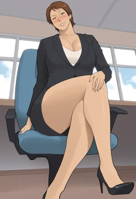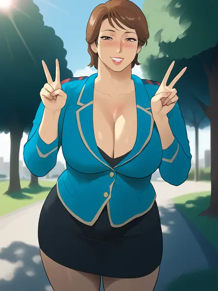MinamiMitsuko, 1girl, 성숙한 여성, 갈색 머리, 단발, 갈색 눈, 귀걸이, 곡선미, 큰 가슴, 허벅지,