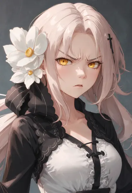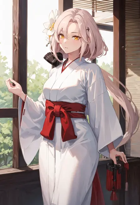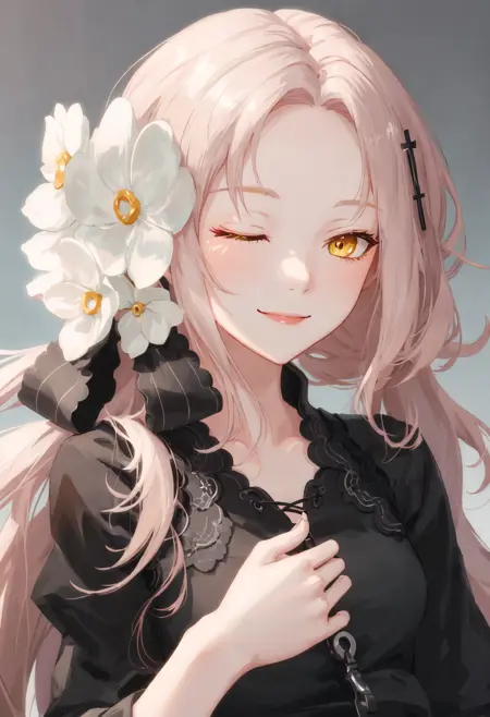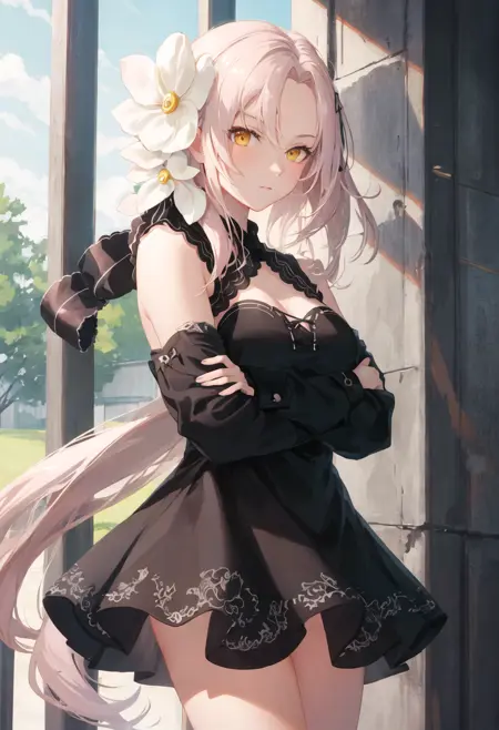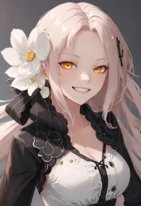 - 필터링된 캐릭터 태그는 다음과 같습니다: long_hair, hair_ornament, hair_flower, yellow_eyes, bangs, breasts, hair_ribbon, ribbon, medium_breasts, blonde_hair, orange_eyes. 캐릭터의 핵심 특징(예: 머리색)이 안정적이지 않을 때 이 태그들을 프롬프트에 추가하세요.