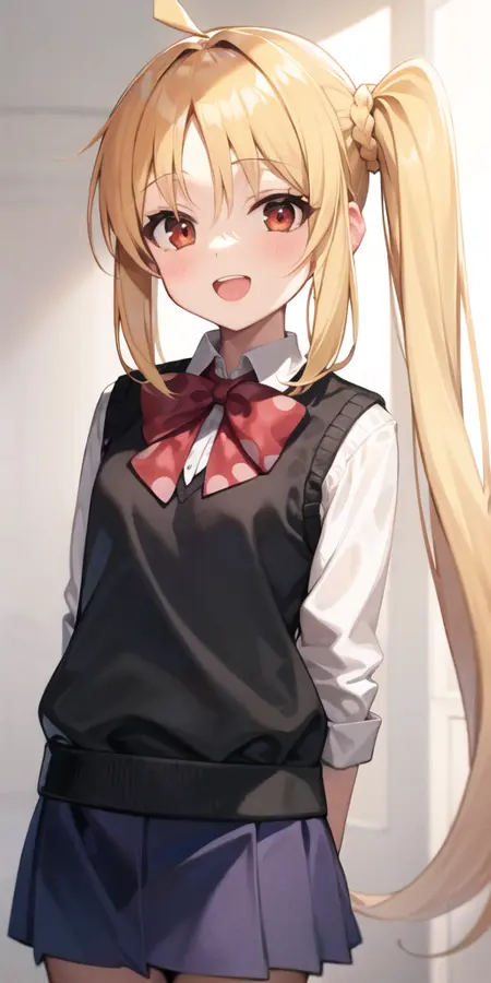 Recommeneded prompts: red eyes, side ponytail, sidelocks,school uniform, skirt,bangs