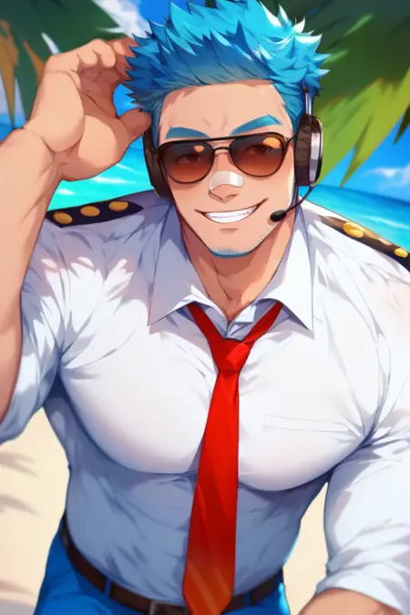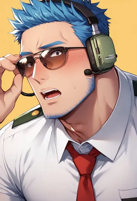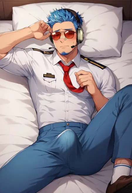 Prompt: blue hair, short hair, black eyes, blue facial hair, jawline stubble, aviation pilot uniform, white collor shirt, red necktie, epaulette, aviator sunglasses, blue pants, socks, black footwear