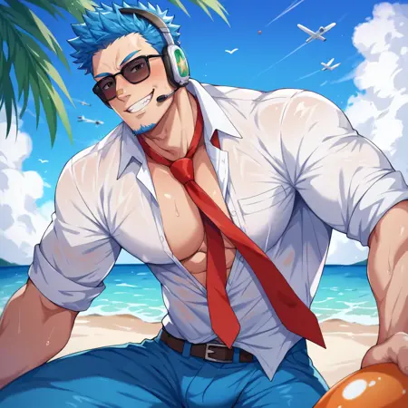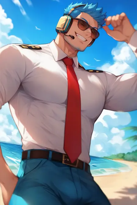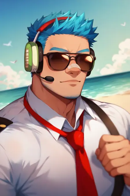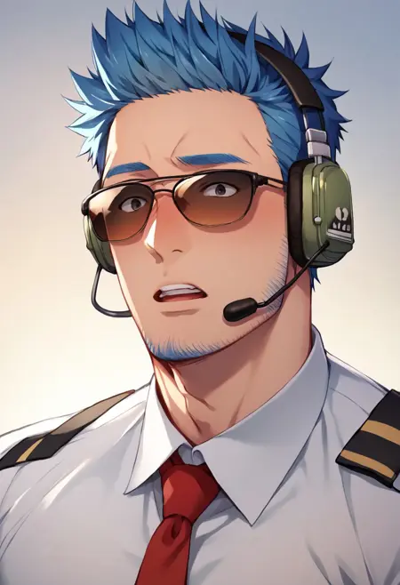 Prompt: blue hair, short hair, black eyes, blue facial hair, jawline stubble, aviation pilot uniform, white collor shirt, red necktie, epaulette, aviator sunglasses, blue pants, socks, black footwear