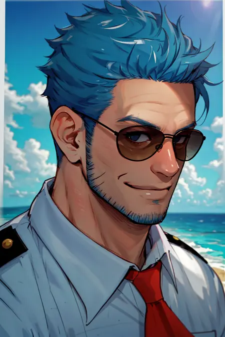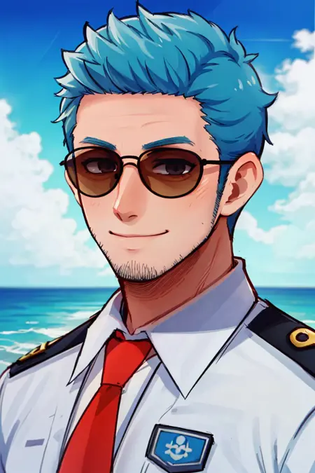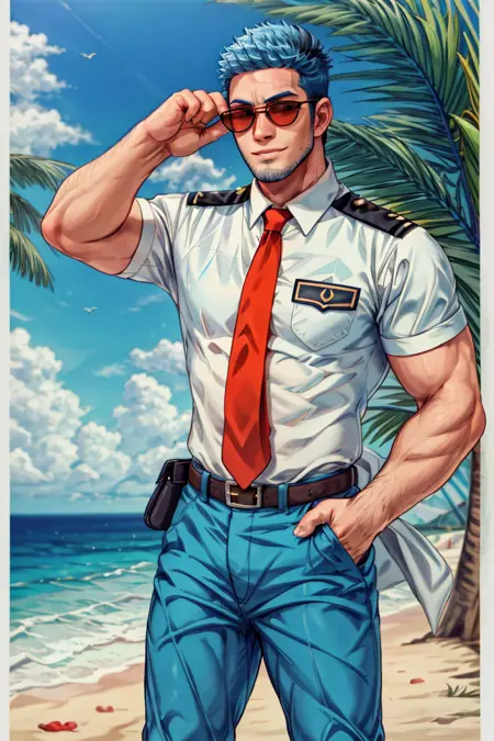 Prompt: blue hair, short hair, black eyes, blue facial hair, jawline stubble, aviation pilot uniform, white collor shirt, red necktie, epaulette, aviator sunglasses, blue pants, socks, black footwear